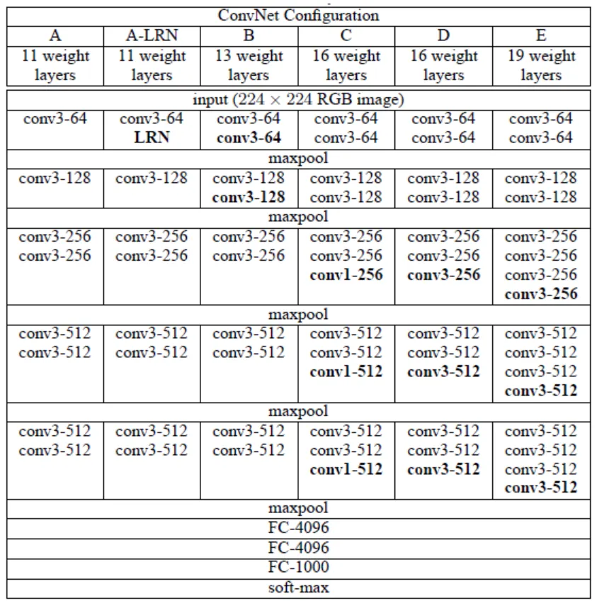 VGGNet 연구팀은 깊이의 영향만을 최대한 확인하고자 Convolutoin 횟수에 따라 6개의 구조로 나누어 성능을 비교함