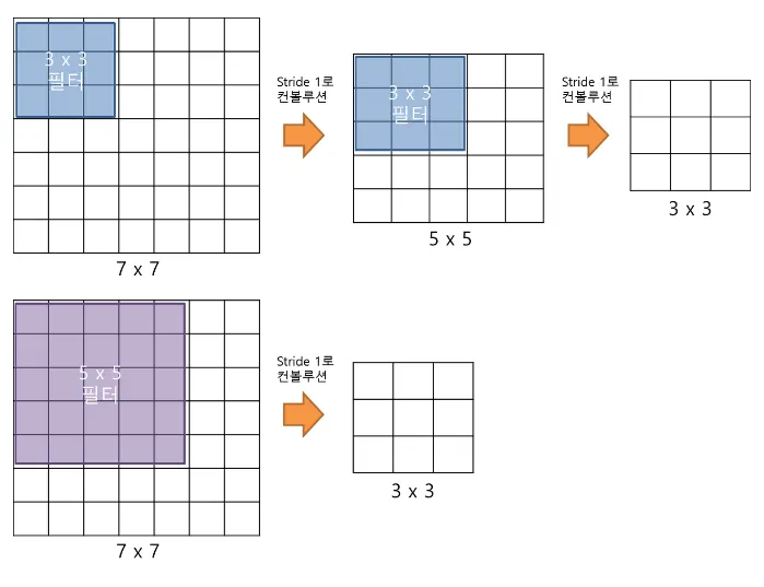 3 x 3 filter로 2번 convolution 하는 것과 5 x 5 filter로 1번 confolution 하는 것은 동일한 사이즈의 feature map을 나타냄